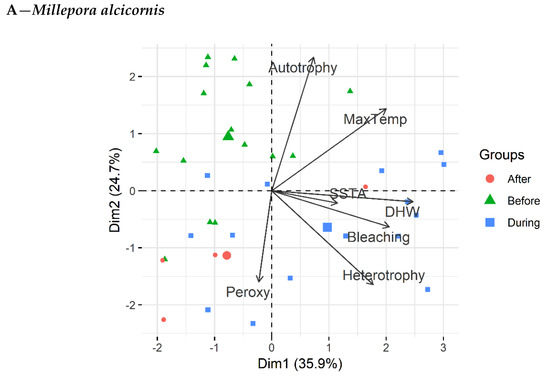 All traits were grouped together [bleaching, maximum temperature (MaxTemp), degree heating weeks (DHW), sea surface temperature anomaly (SSTA), peroxynitrite, auto- and heterotrophy] into a multivariate analysis (PCA) for Mi. alcicornis and Mu. harttii. The two main eigenvectors retained, respectively, 60.6% (Dim1 = 35.9%; Dim2 = 24.7%) and 53.3% (Dim1 = 36.4%; Dim2 = 16.9%) of the total variance (Figure 5A,B). Bleaching, heterotrophy, and DHW were positively correlated with Dim1 (0.60 < R < 0.90) for both species. In turn, while SSTA was strongly correlated with DHW for Mi. alcicornis (Dim1, 0.41 < R < 0.89), it was more associated with MaxTemp for Mu. harttii (Dim1, 0.40 < R < 0.51). Peroxynitrite was associated with autotrophy for Mu. harttii into Dim1 (−0.50 < R < −0.54), while it was correlated with heterotrophy for Mi. alcicornis into Dim2 (−0.57 < R < −0.59). When bleaching is used as a discrete factor (‘before’, ‘during’, and ‘after’), autotrophy was grouped ‘before’ the bleaching event for Mu. harttii, and ‘before’ and ‘during’ for Mi. alcicornis. Heterotrophy, however, was grouped during the bleaching event for both species. In turn, peroxynitrite was grouped ‘before’ the bleaching event for Mu. harttii, and ‘before’ and ‘during’ for Mi. alcicornis, which goes in agreement with the different time lags observed for each species.