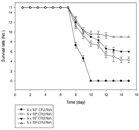 Similar conditions were created for artificial infection to prove the pathogenicity of the bacterial strain SNU WT1 in rainbow trout. The infected fish showed signs of lethargic activity, skin darkening, and erratic swimming motions, and finally resulted in the death of the fish. LD50 of the strain was calculated after observation for 15 days (Figure 1).