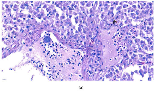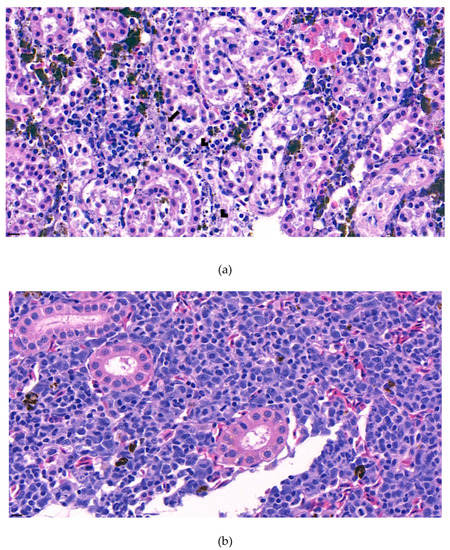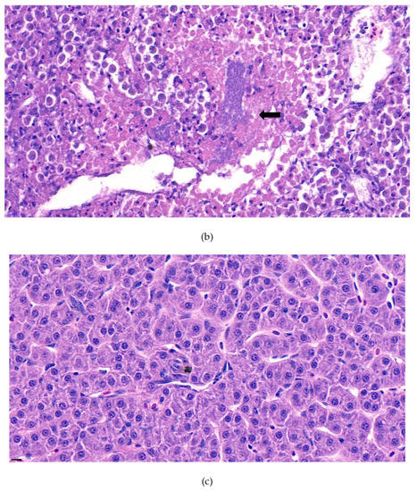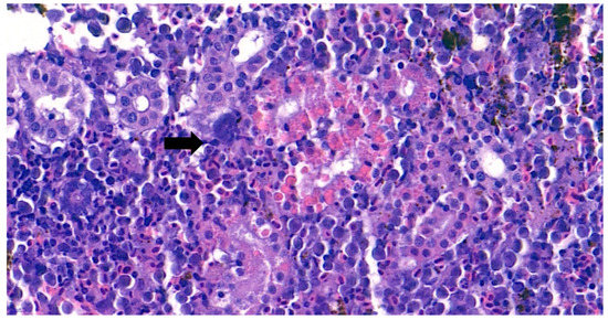 Furthermore, the infiltration of diverse immunocytes, including lymphocytes and macrophages, was observed surrounding the tubule (Figure 2). In addition, signs of bacteremia along the degenerated tubule (Figure 3) were observed with cellular debris surrounding the tubules (Figure 2). Similar signs were also observed in the liver of the diseased fish. A few necrotizing areas with infiltration of macrophages and lymphocytes and vacuolation of hepatic cells was observed (Figure 4a,b).