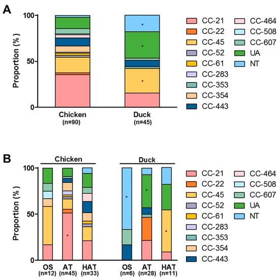 Multilocus sequence typing (MLST) sequence types of C. jejuni strains from retail raw chicken and duck meat (A), and the distribution of MLST clonal complexes (CCs) in C. jejuni strains with different aerotolerance levels from retail raw chicken and duck meat (B) in Korea. UA: unassigned to any CC defined, NT: not typable. *: p < 0.05.