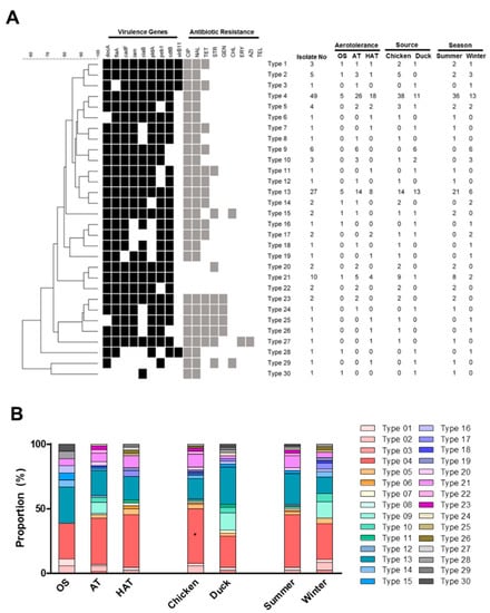 The virulence gene prevalence and antibiotic resistance (Viro and AMR) types of 135 C. jejuni isolates from retail chicken and duck meats in Korea (A) and the distribution of different Viro and AMR types depending on aerotolerance (OS: oxygen-sensitive, AT: aerotolerant, HAT: hyper-aerotolerant), origin (chicken or duck meats), and the season (summer or winter) (B). *: p < 0.05.