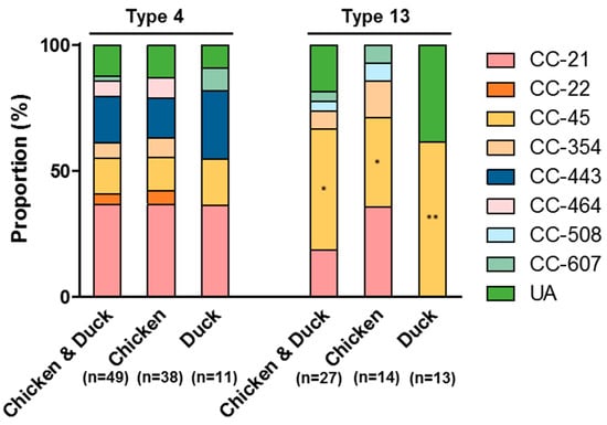 MLST sequence types of the two primary Viro and AMR types, Type 4 and Type 13, in C. jejuni isolates from retail raw chicken and duck meat. *: p < 0.05, **: p <0.001.