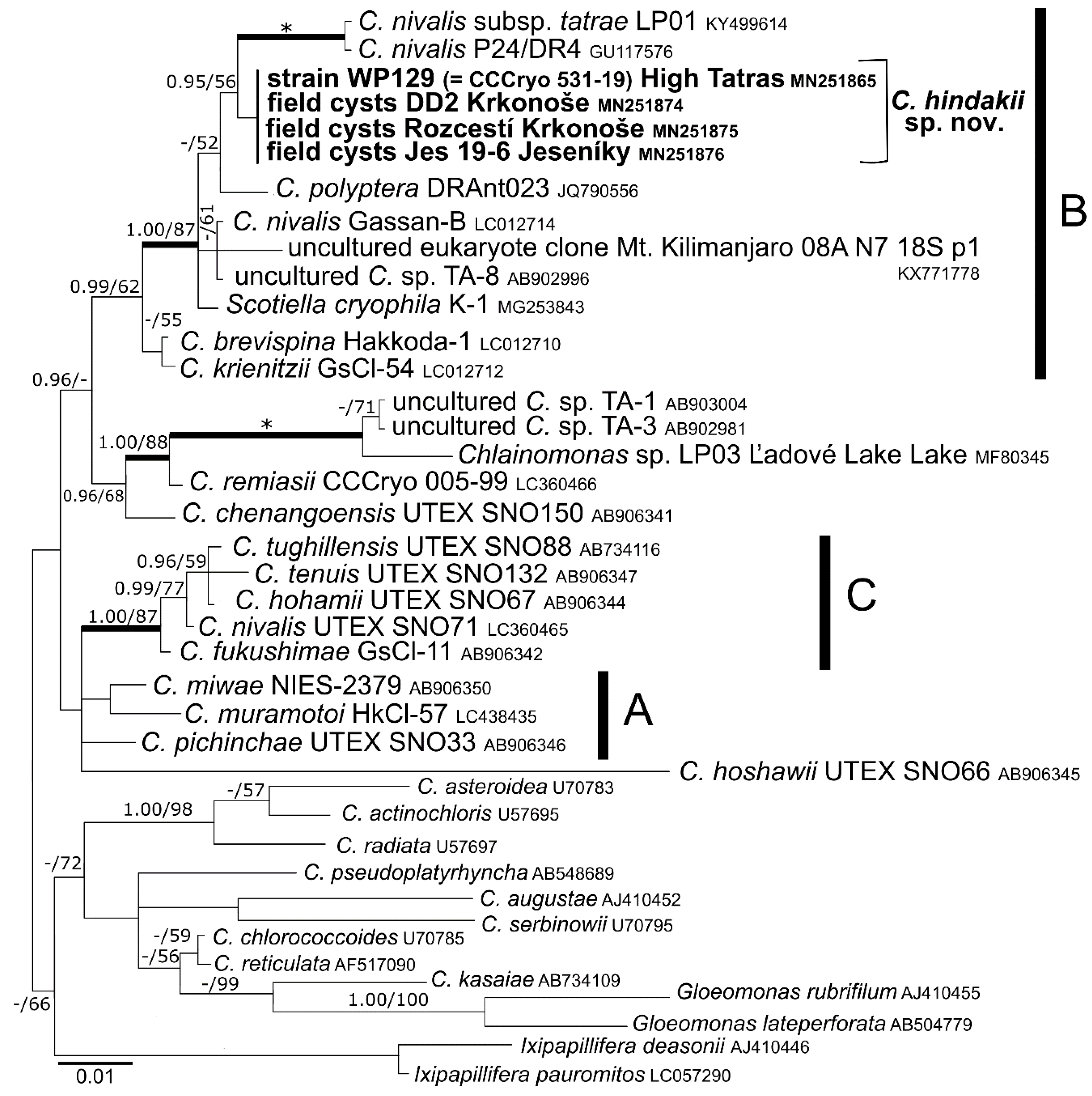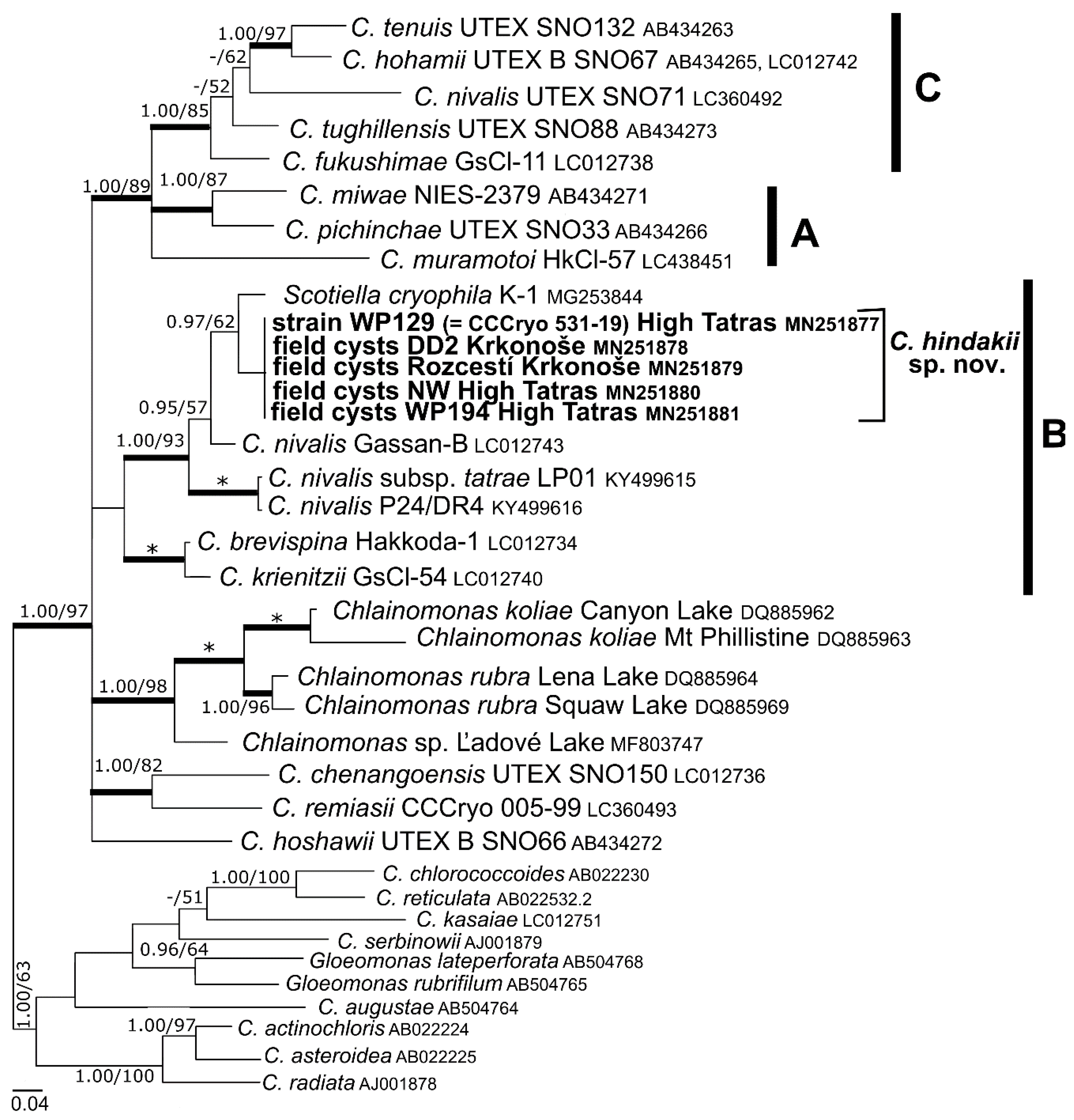 - Matsuzaki, R.; Nozaki, H.; Kawachi, M. Taxonomic revision of Chloromonas nivalis (Volvocales, Chlorophyceae) strains, with the new description of two snow-inhabiting Chloromonas species. PLoS ONE 2018, 13, e0193603. [Google Scholar] [CrossRef]