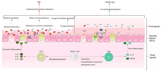 Although most of the gut microbiota are mutualistic or commensal, when “dysbiosis” occurs under certain circumstances, pathogenic bacterial overgrowth can induce certain inflammatory diseases, such as IBD [13]. In this review, we will discuss the collusion between the gut microbiota and the mucosal immune system during the development of IBD.