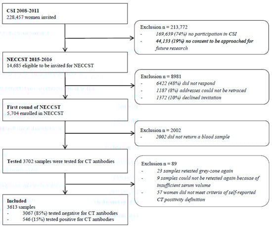 - Hoenderboom, B.M.; Van Oeffelen, A.A.; Van Benthem, B.H.; Van Bergen, J.E.; Dukers-Muijrers, N.H.; Gotz, H.M.; Hoebe, C.J.; Hogewoning, A.A.; Van Der Klis, F.R.; Van Baarle, D.; et al. The Netherlands Chlamydia Cohort Study (NECCST) Protocol to Assess the Risk of Late Complications Following Chlamydia Trachomatis Infection in Women. BMC Infect. Dis. 2017, 17, 264. [Google Scholar] [CrossRef]