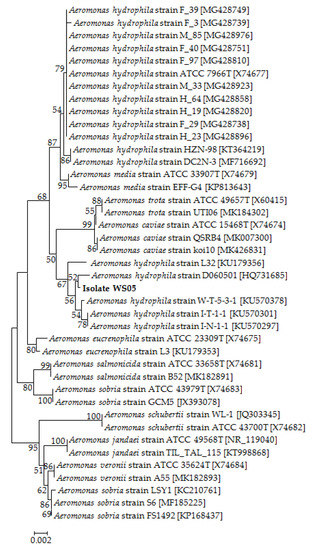- Cao, H.; He, S.; Lu, L.; Hou, L. Characterization and phylogenetic analysis of the bitrichous pathogenic Aeromonas hydrophila isolated from diseased Siberian sturgeon. Isr. J. Aquacult. Bamid. 2010, 62, 181–189. [Google Scholar]