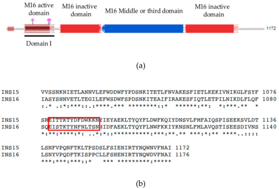 Sequence features of INS-15. (a) Diagram of INS-15 of Cryptosporidium parvum illustrating the presence of one M16 active domain, two inactive domains, and one middle or third domain. The black line identifies the domain I. (b) Alignment of partial amino acid sequences of INS-15 and INS-16 from C. parvum. The red box shows the differences in amino acid sequences between NS-15 and INS-16 in the area of INS-15-specific polypeptide used in the study.
