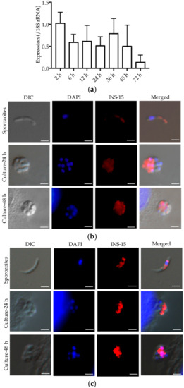 An analysis of the expression of the cgd3_4260 gene over a 72-h time course of C. parvum infection in HCT-8 cells indicated that the highest INS-15 gene expression was at 2 h of the infection (Figure 4a).