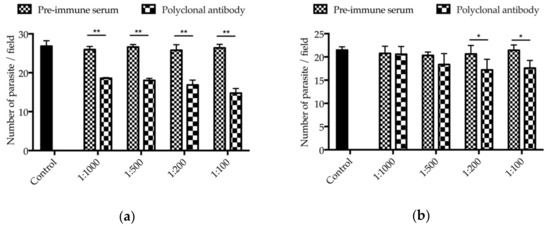 The neutralizing effect of antibodies against INS-15 domain I and polypeptides on C. parvum invasion were assessed using in vitro cell culture. In comparison with the control culture, the mean parasite load was reduced significantly when the cell culture was inoculated with sporozoites treated with antibodies against INS-15 domain I (Figure 5a). The inhibitory effect was 28.4% (26.0 ± 0.8 and 18.6 ± 0.2 parasites per 200× field for pre-immune serum and antibodies, respectively, t(2) = 13.373, p = 0.006) at 1:1000 dilution, 32.2% (26.6 ± 0.6 and 18.0 ± 0.5 parasites per 200× field for pre-immune serum and antibodies, respectively, t(2) = 107.250, p < 0.001) at 1:500 dilution, 34.6% (25.8 ± 1.4 and 16.9 ± 1.2 parasites per 200× field for pre-immune serum and antibodies, respectively, t(2) = 14.820, p = 0.005) at 1:200 dilution, and 44.0% (26.4 ± 0.9 and 14.8 ± 1.2 parasites per 200× field for pre-immune serum and antibodies, respectively, t(2) = 74.389, p < 0.001) at 1:100 dilution. In contrast, the inhibitory effect of antibodies to the INS-15 polypeptide was 0.9% (20.8 ± 1.5 and 20.6 ± 1.7 parasites per 200× field for pre-immune serum and antibodies, respectively, t(2) = 1.104, p = 0.385) at 1:1000 dilution, 9.6% (20.3 ± 0.7 and 18.4 ± 2.4 parasites per 200× field for pre-immune serum and antibodies, respectively, t(2) = 1.880, p = 0.201) at 1:500 dilution, 16.6% (20.6 ± 1.8 and 17.2 ± 2.3 parasites per 200× field for pre-immune serum and antibodies, respectively, t(2) = 8.883, p = 0.012) at 1:200 dilution, and 17.9% (21.4 ± 1.1 and 17.6 ± 1.7 parasites per 200× field for pre-immune serum and antibodies, respectively, t(2) = 6.352, p = 0.024) at 1:100 dilution (Figure 5b).