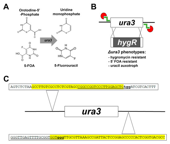 An overview of the ura3 deletion strategy using in vitro assembled Cas9 RNPs coupled with microhomology-mediated end joining (MMEJ). (A) Ura3 decarboxylates orotodine-5′-monophosphate to form uridine monophosphate, an essential uracil precursor, as well as 5-fluorotic acid (FOA), added exogenously, to form a toxic metabolite 5-fluorouracil. (B) Cas9 ribonucleoprotein (RNP)’s target the up and downstream regions of the ura3 gene and the MMEJ repair replaces ura3 with hygR resulting in uracil auxotrophy, 5-FOA resistance, and hygromycin resistance. (C) The regions of microhomology for the repair template are highlighted in yellow, the crRNA sequences are underlined, and the protospacer-adjacent motif (PAM) sites are bolded in lowercase.