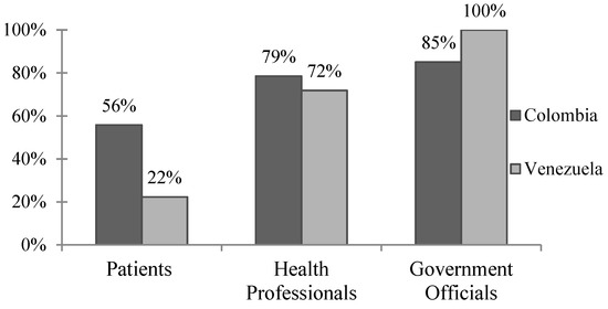 Separate surveys were developed for each of the three subject groups of interest—patients, health professionals, and government officials. Surveys were collected from February through June of 2018. Patients were recruited from the waiting room of participating health clinics. In Colombia, these health care facilities were located in Barranquilla as well as the surrounding areas of Galapa, Baranoa, Rioviejo-Bolivar, and Soledad. In Venezuela, participating clinics included Hospital Universitario de Los Andes, Centro de Atención Médica Integral de la Universidad de Los Andes (CAMIULA, the university clinic), Unidad de Larga Eatancia, and one of the largest private clinics in the city. Providers at the same participating clinics were invited to complete the health professional survey. In Venezuela, the health professional survey was also circulated via an infectious disease WhatsApp group at the University of the Andes. Government officials were individually chosen and invited to participate in the study by local team members.