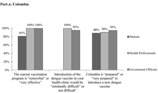 A total of 92% of health professionals cited no current barriers to providing mandated vaccines (Table 3). All health professional and government official respondents and approximately 80% of patients reported that the current vaccination program is “somewhat effective” or “very effective” (Figure 2a). While 63.6% of government officials cited financial concerns when asked specifically about barriers to implementing a dengue vaccine, most health professionals selected “none.” Other barriers reported included rural areas, administrative barriers, lack of public awareness, and resistance to vaccinations. None of the government officials reported that the vaccination rate is equal in all areas of the country. On the whole, the vast majority of health professional and government respondents felt that the introduction of the dengue vaccine in their clinics would be “minimally difficult” or “not difficult.” Similarly, the vast majority of all respondents reported that Colombia is “prepared” or “very prepared” to introduce a new dengue vaccine (Figure 2a).