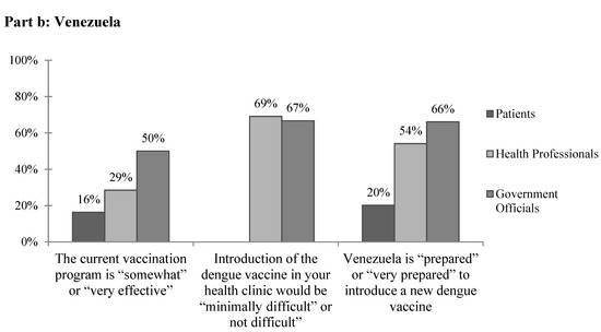 In Merida, there was often incongruity between the responses of patients, health professionals, and government officials, with patients least likely to view dengue as a current problem or to support current vaccination and surveillance programs. With only 20.2% of patients and 54.1% of health professionals reporting that Venezuela is prepared to introduce a new dengue vaccine, it is clear that there is still much to be done to develop public trust and country capacity. This does not come as much of a surprise considering the ongoing humanitarian concerns and political unrest throughout the country. This study suggests that future work in Venezuela be focused on bettering its current vaccination and surveillance systems rather than the introduction of a new vaccine, which could overwhelm current programs. This study can serve as a framework for future assessments of the acceptability and feasibility of a dengue vaccine in both targeted areas and on a larger scale.