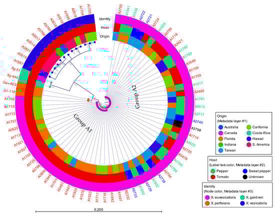 X. euvesicatoria had greater representation in our collection (58 out of 76 strains), but exhibited less diversity compared to X. vesicatoria. This may indicate that relatively uniform populations of X. euvesicatoria were spread through the contaminated seed. Group A1 strains with identical sequences were isolated from plants in California, Florida, and Taiwan, and group A2 strains were from California, Florida, Hawaii, Taiwan, and Australia. The presence of identical genotypes across Asia and America (group A1) and America, the Pacific, Asia, and Australia (group A2) clearly suggests that international seed trade played a significant role in spreading this BLS pathogen across the globe. Interestingly, X. perforans, first detected in Florida in 1991, was also not found in our collection—this indicates that this species emerged in Florida after 1990.