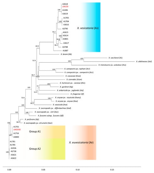3.3. Phylogenetic Position of X. vesicatoria and X. euvesicatoria Relative to Other Xanthomonads