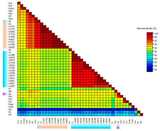 Color-coded matrix showing pairwise percentage identity of Xanthomonas euvesicatoria, X. vesicatoria with other species of Xanthomonas for chromosomal replication initiator factor (dnaA), type I glyceraldehyde-3-phosphate dehydrogenase (gapA), DNA topoisomerase (ATP-hydrolyzing) subunit B (gyrB), hydroxymethylbilane synthase (hmbs), and pyruvate dehydrogenase (pdg) genes. The information about the strains is provided in Table 1.