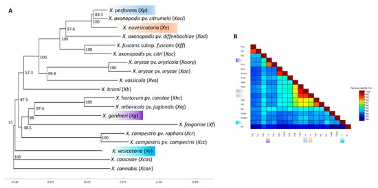 Phylogenetic positions of Xanthomonas euvesicatoria and X. vesicatoria and other Xanthomonas species using chromosomal replication initiator factor (dnaA), type I glyceraldehyde-3-phosphate dehydrogenase (gapA), DNA topoisomerase (ATP-hydrolyzing) subunit B (gyrB), hydroxymethylbilane synthase (hmbs), pyruvate dehydrogenase (pdg), molecular chaperone DnaK (dnaK), sugar ABC transporter permease (lacF), elongation factor G (fusA), and citrate synthase (gltA) genes. (A) Phylogenetic tree showing the positions of Xanthomonas species, (B) color-coded heat map generated from concatenated sequences of nine complete genes (mentioned above). Numbers on the nodes represent bootstrap values and are presented as a percentage of 1000 replicates. Line in the bottom represents the scale bar that shows the distance between the species.