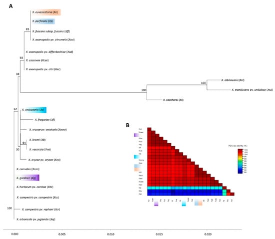 Phylogenetic analysis of species of plant pathogenic Xanthomonas (Table 3) using complete 16s rRNA gene sequence. (A) Phylogenetic tree showing the position of Xanthomonas euvesicatoria and X. vesicatoria within the other species of plant pathogenic Xanthomonas. (B) Color-coded matrix showing pairwise percentage identity of 16s rRNA sequences of X. euvesicatoria and X. vesicatoria with the other species of plant pathogenic Xanthomonas. Numbers on the nodes represent bootstrap values and are presented as the percentage of 1000 replicates. Line in the bottom represents the scale bar that shows the distance between the species.
