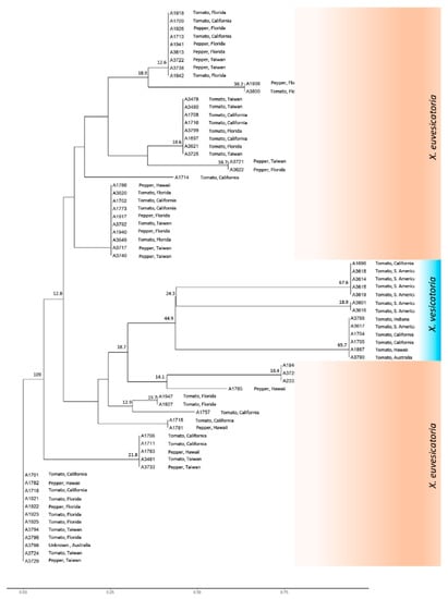 Surprisingly, the greatest genetic diversity was observed within the smaller number of X. vesicatoria (n = 14) strains evaluated in this study, rather than within X. euvesicatoria strains. Concatenated analysis of X. vesicatoria formed small subgroups within the larger X. vesicatoria clade; similar groups were formed when the phylogenetic tree was generated using individual genes. Higher diversity within X. vesicatoria was also reported by other researchers [8,17,27]. Geographic separation of groups within X. vesicatoria has also been reported by Timilsina et al. [17]. Most of the X. vesicatoria strains used in this study were from South America and California; they formed five small subgroups, whereas individual strains from Australia, Indiana, and Hawaii showed distinct genotypes and grouped separately from South American and Californian strains. X. vesicatoria strain A1887 from Hawaii was distinct from all the other X. vesicatoria. Two X. vesicatoria strains (A3618 and A3619) from South America were identical to A1696 from California; this also could be due to the movement of infected seeds from one location to the other.
