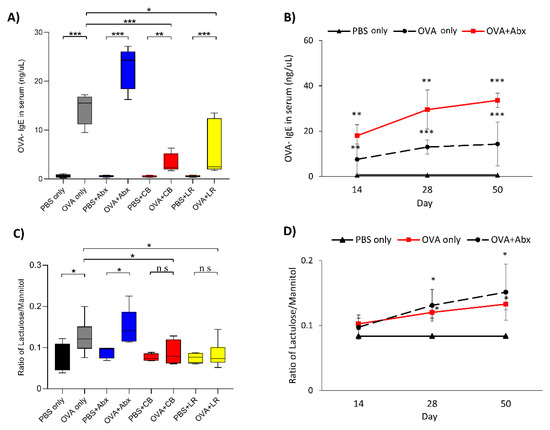 (A) Serum OVA-IgE level rose in all OVA-sensitized rats, but was significantly decreased by probiotics administration in comparison with the OVA sensitization group. (B) Time course of serum OVA-IgE level. Serum OVA-IgE level began to rise significantly from the second week in both the OVA sensitization and OVA sensitization with antibiotics groups. The levels in the OVA sensitization groups continued with no differences between those with and without antibiotic administration. (C) Intestinal permeability assay of lactulose/mannitol metabolism and absorption. An increase in this ratio indicates increased intestinal permeability. (D) Time course of intestinal permeability. The degree of intestinal permeability began to rise significantly from the fourth week in both the OVA sensitization and OVA sensitization with antibiotics groups. The intestinal permeability levels in the OVA sensitization groups continued with no differences between those with and without antibiotic administration. Boxes represent the 25th to 75th percentiles; middle bar identifies the median; whiskers show the minimum and maximum (n = 5–7 rats per group). * p < 0.05, ** p < 0.01, *** p < 0.001 determined by analysis of variance (ANOVA) with the Tukey–Kramer method. ns, no significance; Abx, antibiotics; CB, C. butyricum; LR, L. reuteri.