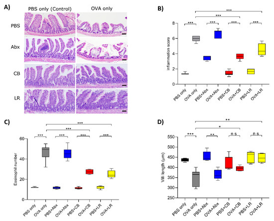 (A) Jejunal tissue sections were stained with hematoxylin and eosin for histological examination. Although the jejunal villi were damaged in the OVA-sensitized group and those in rats that had received antibiotics, those in rats that had received probiotics were only mildly affected. Scale bars, 100 μm. (B) Histological examination was performed by assigning a score for epithelial damage and leukocyte infiltration on microscopic cross-sections of the jejunum in each rat. (C) The number of infiltrating eosinophils was counted in the lamina propria of the jejunum, and representative numbers were obtained from 10–15 measurements per sample. (D) Villus length in jejunal epithelial cells was measured. Boxes represent the 25th to 75th percentiles; middle bar identifies the median; whiskers show the minimum and maximum (n = 5–7 rats per group). * p < 0.05, ** p < 0.01, *** p < 0.001 determined by ANOVA with the Tukey–Kramer method. ns, no significance; Abx, antibiotics; CB, C. butyricum; LR, L. reuteri.