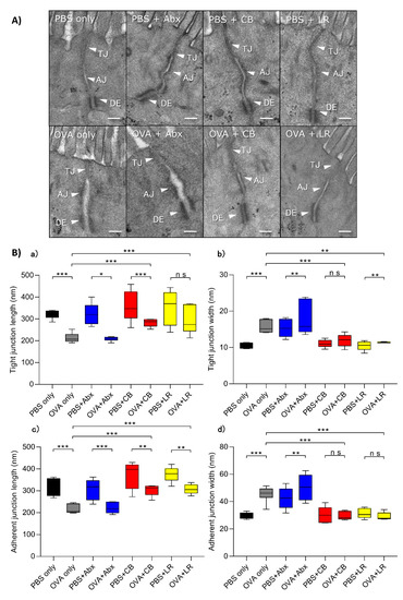 Compared with the non-sensitized group, damage to the TJs as well as the adherens junction was evident in intestinal villus epithelial cells in the OVA-treated group (OVA only) (Figure 4A). Moreover, in OVA-sensitized rats given antibiotic treatment, the intercellular junctions were shortened and disrupted, and the intercellular spaces were widened. On the other hand, the TJs and adherens junctions in each of the OVA-sensitized and probiotic-treated groups showed almost normal features (Figure 4A). A quantitative analysis of the length and width of TJs revealed significant widening and shortening in the OVA-sensitized group (OVA only) and the OVA-sensitized and antibiotic-treated group (Figure 4Ba,Bb) relative to the control. On the other hand, the OVA sensitization group treated with probiotics did not show TJ widening and shortening. Observations of the adherens junction revealed results similar to those for the TJ (Figure 4Bc,Bd).