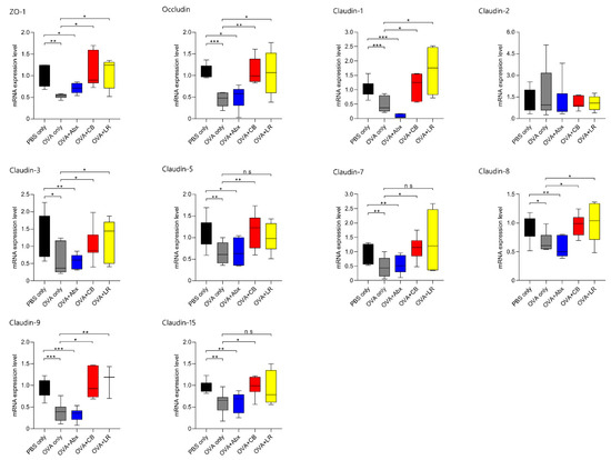 In the OVA-sensitized and antibiotic-treated rats, ZO-1 (p < 0.05), occludin (p < 0.01), claudin-1 (p < 0.001), claudin-3 (p < 0.01), claudin-5 (p < 0.05), claudin-7 (p < 0.01), claudin-8 (p < 0.01), claudin-9 (p < 0.001), and claudin-15 (p < 0.01) were also down-regulated relative to the PBS only group. On the other hand, in each of the groups treated with probiotics (C. butyricum, and L. reuteri), the expression levels of TJ proteins (ZO-1; occludin; claudin-1, -3, -5, -7, -8, -9, and -15) were up-regulated relative to the OVA only group (except for claudin-5, -7, and -15 after administration of L. reuteri to OVA-sensitized rats).