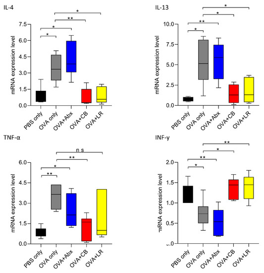 Total RNA was extracted from the jejunal tissue of rats, and the mRNA expression of Th2 and inflammatory cytokine were examined by real time PCR. Data are presented as the fold change in gene expression relative to the control (PBS only). Interleukin (IL)-4, IL-13, tumor necrosis factor (TNF)-α, and interferon-gamma (INF-γ). Each value is represented as the mean ± SEM (n = 5–7 rats per group). Boxes represent the 25th to 75th percentiles; middle bar identifies the median; whiskers show the minimum and maximum (n = 5–7 rats per group). * p < 0.05, ** p < 0.01 determined by ANOVA with the Tukey–Kramer method. ns, no significance; Abx, antibiotics; CB, C. butyricum; LR, L. reuteri.