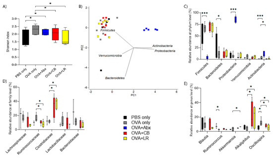 Analysis of the overall bacterial community structure demonstrated that rats treated with C. butyricum and L. reuteri had a significantly less diverse community than OVA-sensitized rats without probiotic treatment (OVA only) (Shannon’s index, OVA = 2.3 ± 0.2 vs. OVA + C. butyricum = 1.8 ± 0.3; OVA + L. reuteri = 1.7 ± 0.4; Figure 8A).