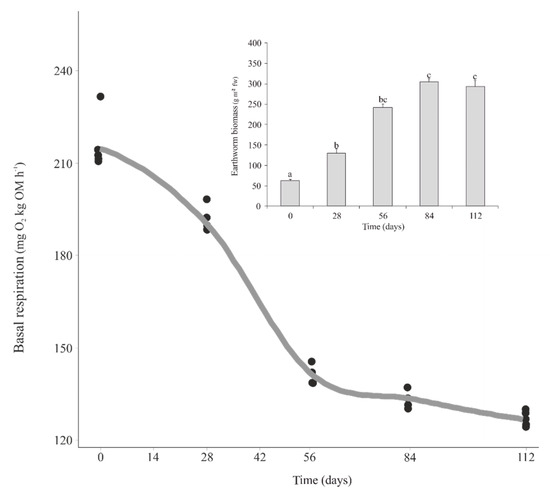 Changes in microbial activity measured as basal respiration during vermicomposting of grape marc derived from the red winemaking process of the grape variety Mencía. Individual values (n = 5) are plotted for each time point, and the curve was plotted using the “loess” smoothing method in ggplot2 [46]. The inset shows changes in earthworm biomass during the process. Earthworm biomass values are presented as means ± standard error (n = 5). Letters indicate significant differences between time points (Tukey HSD test).
