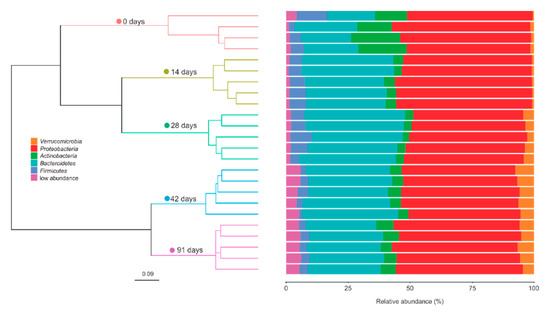 Changes in the bacterial community composition (phylum level) during vermicomposting of grape marc derived from the red winemaking process of the grape variety Mencía. The dendrogram represents the dissimilarity of bacterial communities at ASV levels (unweighted UniFrac distances, Ward method). Bars represent the relative abundance of dominant bacterial phyla. Bacterial phyla with lower relative abundances (<1%) were grouped together.
