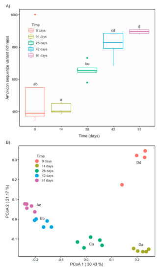 We filtered the data set removing ASVs with less than three sequences and not present in at least 5% of samples. By doing this, we removed 77% of ASVs but only 3% of sequences. Rarefaction curves indicated that the sampling depth was optimal for all samples in the full data set (7163 ASVs and 2,171,729 sequences, Figure S1) and the filtered data set (1646 ASVs and 2,106,626 sequences, Figure S2). We normalized ASV counts using the variance-stabilizing transformation for analysis that assumes homoscedasticity or could be influenced by unequal variances [37]. We used raw ASV counts when analysing differential ASV abundances with negative binomial models as implemented in the package DESeq2 [37,38]. Differential abundances of ASVs and other bacterial taxa (phylum and class) were determined according to Wald tests and p-values adjusted by false discovery rate (FDR < 0.05). Since multiple pairwise Wald tests were conducted for each time to time comparison (0–14, 14–28, 28–42, and 42–91 days), we further adjusted these p-values using the Benjamini–Hochberg method to correct for these multiple pairwise comparisons. After correction, non-significant contrasts were considered to have an effect size (log2 fold change) of zero.