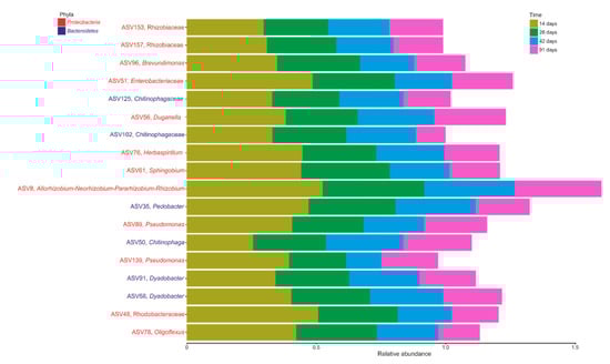 A total of eighteen ASVs were identified as the bacterial core microbiome during vermicomposting of Mencía grape marc, and they were present in all of the samples from days 14, 42, 28, and 91 (Figure 4). These ASVs represented 1.61% of total ASVs and 16.25% of all sequences. The initial grape marc (day 0) was not considered within the core microbiome because this sample was not subjected to the action of earthworms. Twelve of these ASVs belonged to the phylum Proteobacteria and the other six to the phylum Bacteroidetes (Figure 4). The phylum Proteobacteria comprised ASVs from the families Rhizobiaceae (ASV153 and ASV157), Enterobacteriaceae (ASV51) and Rhodobacteraceae (ASV48), and from the genera Brevundimonas (ASV96), Duganella (ASV56), Sphingobium (ASV61), Allorhizobium-Neorhizobium-Pararhizobium-Rhizobium (ASV8), Pseudomonas (ASV89 and ASV139) and Oligoflexus (ASV78). The abundance of the ASVs 48, 51, 61, 96, and 78 was significantly different between days 28 and 42 (Table S1). Moreover, the ASVs 78 and 139 differed in abundance between days 42 and 91 (Table S1).