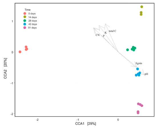 Canonical correspondence analysis (CCA) was performed by calling the “cca” function from the vegan package [44] via phyloseq. A total of six physico-chemical parameters (lignin content, pH, total C, K, P and C to N ratio) were chosen by the CCA model as those that significantly differentiated Mencía grape marc bacterial communities over the course of the vermicomposting process. The abovementioned physico-chemical parameters were determined as described in Gómez-Brandón et al. [24]. For the CCA model, the P values from the permutation tests were less than 0.05, indicating that the CCA model explained more variance of the bacterial communities during grape marc vermicomposting than expected by chance.