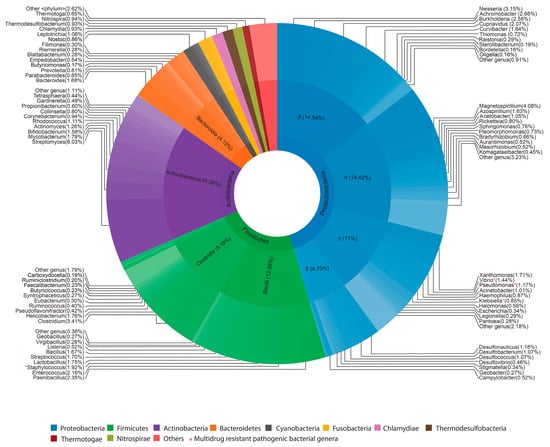 Bacterial taxonomic distribution of flooded sites. Sunburst plot showing the taxonomic classification and relative abundance of bacterial species in flooded sites. The taxonomic phylum is represented in the innermost ring, class in the middle, and genus are represented in the outermost ring of the circle. Within each taxonomic classification, taxa are sorted according to its abundance. A red * symbol represents the multidrug-resistant pathogenic bacteria present in flooded sites. See Table S1 for the full list of bacterial taxa found in flooded sites.