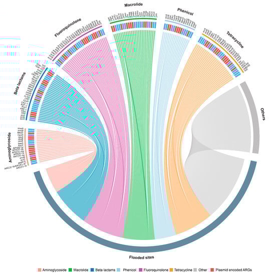 Resistome of the flooded sites. Chord diagram showing the presence of Antibiotic Resistance Genes (ARGs) detected in flooded sites. ARGs in flooded sites were classified into 6 major drug classes. The coloured edges represent the proportion of ARGs of different drug classes detected in flooded sites. ARGs conferring resistance to aminocoumarin, sulfonamide, mupirocin, rifampicin, triclosan, glycopeptide and diaminopyrimidine classes of antibiotics are represented as others category. Red blocks indicate plasmid-encoded ARGs. A complete list of antibiotic resistance genes and their characteristics are listed in Table S4.