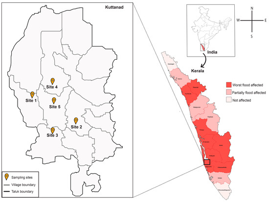 Flooding is one of the most destructive natural disasters, resulting in significant damages to life and infrastructure worldwide [1]. The devastating flooding in the southern state of India (Kerala) during August 2018 was declared as a “calamity of severe nature”, leaving 23 million people affected [2,3]. This was the worst ever flood in the history of Kerala since the Great flood in 1924 [4]. During this season, Kerala state received a cumulative rainfall of 2346.3 mm, 42% greater than the monsoon average [5]. 35 out of 54 dams within the state were opened due to the heavy rainfall in its catchment areas. The flood left 10,319 houses fully damaged, more than 0.1 million houses partially damaged, destroyed 83,000 km of roads, including 10,000 km of major roads, and 60,000 hectares of crops causing nearly $2.9 billion worth of damage [2,3]. Previous epidemiological evidence suggests that floods are positively associated with increased risk of water-borne and vector-borne diseases such as skin infection, typhoid fever, cholera, leptospirosis, hepatitis A, malaria, dengue fever, yellow fever and West Nile fever [6,7]. The stagnant floodwater can also significantly affect the environmental microbiome and spread of microbial pathogens [8].