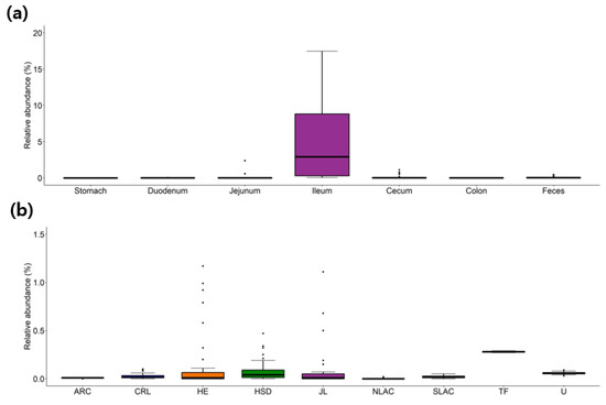 Additionally, a relative abundance of each taxon at different locations in the GI tract was also visualized as a series of boxplots, which provides users straight forward information about the distribution of each species or higher taxa. For example, the overall distribution of strains belonging to the Candidatus genus Arthromitus, previous known as segmented filamentous bacteria (SFB), along the GI tract of the healthy mice, is visualized in Figure 1a. The SFB has been extensively studied as an important modulator of mouse immunity [40] and is known to be present in a higher proportion in mice obtained from Taconic Farms than Jackson Laboratory [40], which was confirmed in our database (Figure 1b).