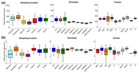 A variety of alpha-diversity indices (ACE, Chao1, Jackknife, Shannon, Simpson, NPShannon, Phylogenetic diversity) were calculated and provided for each microbiome sample along with the rarefaction curve at the web site (e.g., see http://leb.snu.ac.kr/mmdb/sample/SRS347361 for a cecum sample of a PWK/PhJ mouse from Jackson Laboratory). The distributions of Chao1 and Shannon were further analyzed with the rarefied number of reads (10,175 reads per sample) in detail (Figure 2 and Table S1). As reported in multiple studies [41,42,43,44], species richness and evenness of microbiome samples from different GI locations, genotypes and vendors varied substantially. Species richness indicated by Chao1 is expected to be higher in the feces than ileum and jejunum [41], and species evenness indicated by Shannon is expected to be higher in the cecum, colon and feces than ileum and jejunum [44] which can be easily confirmed in Figure 2a and Table S1.