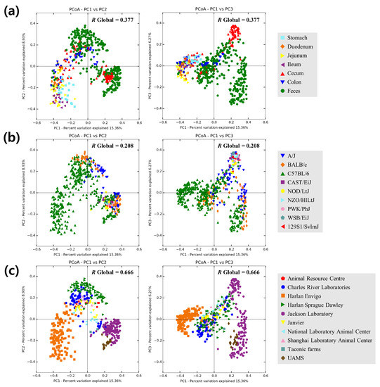 To assess overall relationships among the samples held in the database, the beta-diversity was calculated with the rarefied number of counts (6,266 counts per sample) using Bray–Curtis distances and principal coordinates analysis (PCoA). Bacterial communities in the cecum, colon and feces samples are expected to cluster closely to one another [44], and it was also found in PCoA plot (Figure 3a) and ANOSIM pairwise comparisons (Table S2). The type of vendor (ANOSIM R = 0.666 and p = 0.001; Figure 3b) was a significant factor for the difference in taxonomic composition, whereas the genotype (ANOSIM R = 0.208 and p = 0.001; Figure 3c) was a less significant factor for the difference, which was similar result to Ericsson et al. [21].