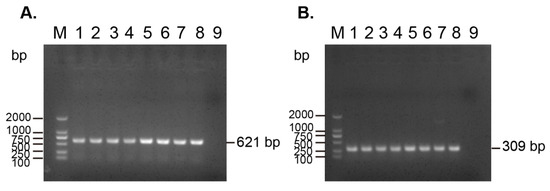 PCR detection of the carbapenem-resistant gene blaNDM-1 and the colistin-resistant gene mcr-1 from (A) the plasmids extracted from the eight carbapenem-resistant and (B) the colistin-resistant E. coli strains. M: DL 2000 DNA marker; 1–8: plasmid from RXD007, RXD012, RXD020, RXD024, RXD033, RXD035, RXD100, and RXD115; 9: ddH2O as negative control.