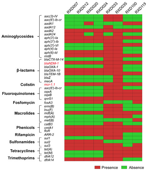 - Zankari, E.; Hasman, H.; Cosentino, S.; Vestergaard, M.; Rasmussen, S.; Lund, O.; Aarestrup, F.M.; Larsen, M.V. Identification of acquired antimicrobial resistance genes. J. Antimicrob. Chemother. 2012, 67, 2640–2644. [Google Scholar] [CrossRef]