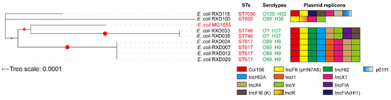 The assembled contigs were used for determining the genetic characteristics of the eight E. coli isolates. Serotypes and sequence types (ST) were determined by SerotypeFinder 2.0 [18] and Multi-Locus Sequence Typing (MLST) 2.0 [19], respectively. Acquired antimicrobial resistance genes and plasmids were determined using ResFinder 3.1 [20] and PlasmidFinder 2.0 [21], respectively. DNA identities between two sequences were calculated by ANI calculator [22]. A comparative genome analysis was performed and visualized using the BRIG package [23] and/or the EasyFig package [24]. Phylogenetic analysis was performed by the maximum likelihood method using the Tamura–Nei model [25] on MEGAX [26] with 1000 bootstrap iterations. The whole genome sequence of E. coli MG1655 (GenBank accession no. U00096.3) was downloaded from GenBank and used as the reference genome in the study.