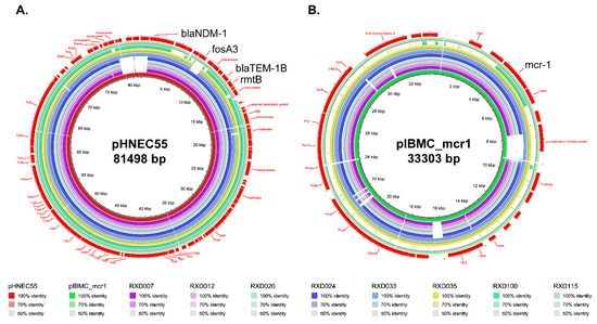 Comparison of plasmid pHNEC55 (panel A) and pIBMC_mcr1 (panel B) with the genomes of RXD007, RXD012, RXD020, RXD024, RXD033, RXD035, RXD100, and RXD115, displayed as the outer rings inside to outside, respectively. The outmost rings (red) show the functional genes including the resistance genes as well as the structural genes carried by pHNEC55 (panel A) and pIBMC_mcr1 (panel B).