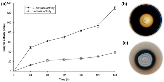 Test of the enzyme activity of the Trametes hirsuta Bm-2 strain. (a) Quantitative activity of laccase and α-amylase enzymes, (b) screening for amylolitic activity in plates incubated at 32 °C for 144 h, (c) screening for laccase activity in plates incubated at 32 °C for 96 h. The results are represented as the mean ± standard deviation of three parallel measurements (n = 3).