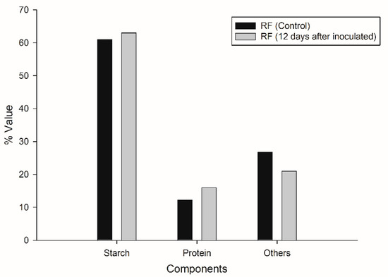 Analysis of the main components of initial and residual flour indicated that slight changes occurred in its chemical composition after CBP (Figure 5). Starch content showed a slight increase of 2 percentage points; the similarity of starch contents in the initial and the residual flour may be due to the fact that, being in stationary conditions, the enzymes were only active in the aqueous and semi-solid interface of the mixture. The protein content increased from 12.24% to 16%, which can be attributed to the fact that parts of the mycelium, with high protein content, were deposited in the flour (Figure 3c) as well as to the presence of remnants of the enzymes released by the fungus. The content decrease of the third component of RF (fibers, ashes, phenols, etc.) can be attributed to the ability of the fungus to use the phenols present in RF through the action of the laccase enzyme. Part of the insoluble fiber could also be hydrolyzed by T. hirsuta, as it is able to produce cellulases, in agreement with previous studies reported by Castoldi et al. [46].