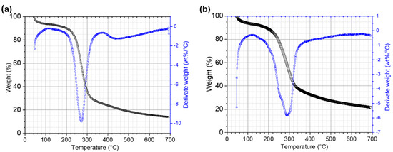 Elemental analysis (C, H, N, and S) was carried out using a Thermo Scientific Elemental Analyzer Flash 2000 (Thermo Scientific, Waltham, MA, USA). The functional groups on the carbon surface were determined by Fourier transform infrared spectroscopy (FTIR) with a Bruker FT-IR Tensor II (Bruker, Ontario, ON, Canada). This analysis was carried out with the attenuated total reflection (ATR) accessory. Thermogravimetric analyses (TGA) of initial and final samples were carried out using a Perkin Elmer TGA 8000 (PerkinElmer, Walthman, MA, USA). A TG curve was obtained under a nitrogen atmosphere with a flow rate of 10 mL/min and a heating rate of 10 °C/min from 50 to 700 °C with a sample mass of 10 mg in a platinum pan. The mass loss rate in the derivative form (derivative thermogravimetry, DTG) was also calculated.