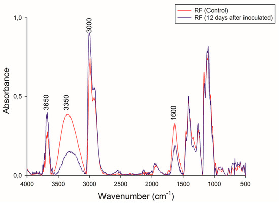 FT-IR spectral of initial and final biomass. Red line: RF control, and black line: residual RF 12 days.