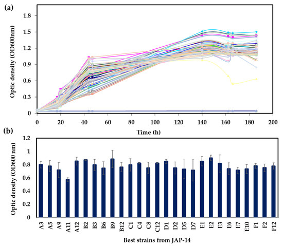 Selection of yeasts based on growth in xylose. (a) Growth profile of the 96 yeasts in defined medium. The colored lines represent the different strains of the plate JAP-14 (b) Final growth in 180 h for the 30 best strains in the microtiter plate JAP-14. Average and standard deviation for four replicates are shown.