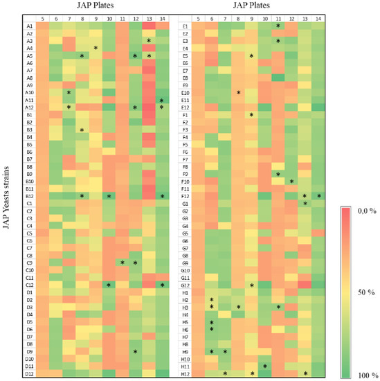 Heat Map showing the growth score of the 960 yeast strains screened on defined medium supplemented with xylose after 120 h. The lines represent the yeast strains code in each plate, whereas the columns the plate numbers. All the values were normalized with the highest growth (OD600 120 h–OD600 0 h); i.e., 100% equals to OD600 1.47. The 42 selected yeast strains are indicated by *.